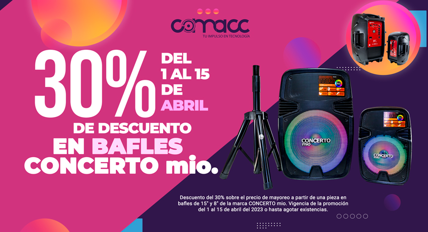 ¡No dejes de escuchar tu música favorita con el mejor audio! Disfruta de las vacaciones con los Bafles CONCERTO mio de 15” y 8” con 30% de descuento sobre mayoreo. Descuento válido del 01 al 15 de abril de 2023.