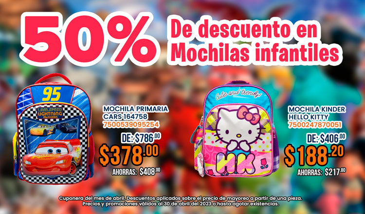 Mochilas con diseños infantiles en liquidación encuentra variedad de modelos al precio más bajo. No dejes pasar esta oportunidad, visítanos en tu tienda Comacc más cercana. Vigencia del 01 al 30 de abril de 2023 o hasta agotar existencias.